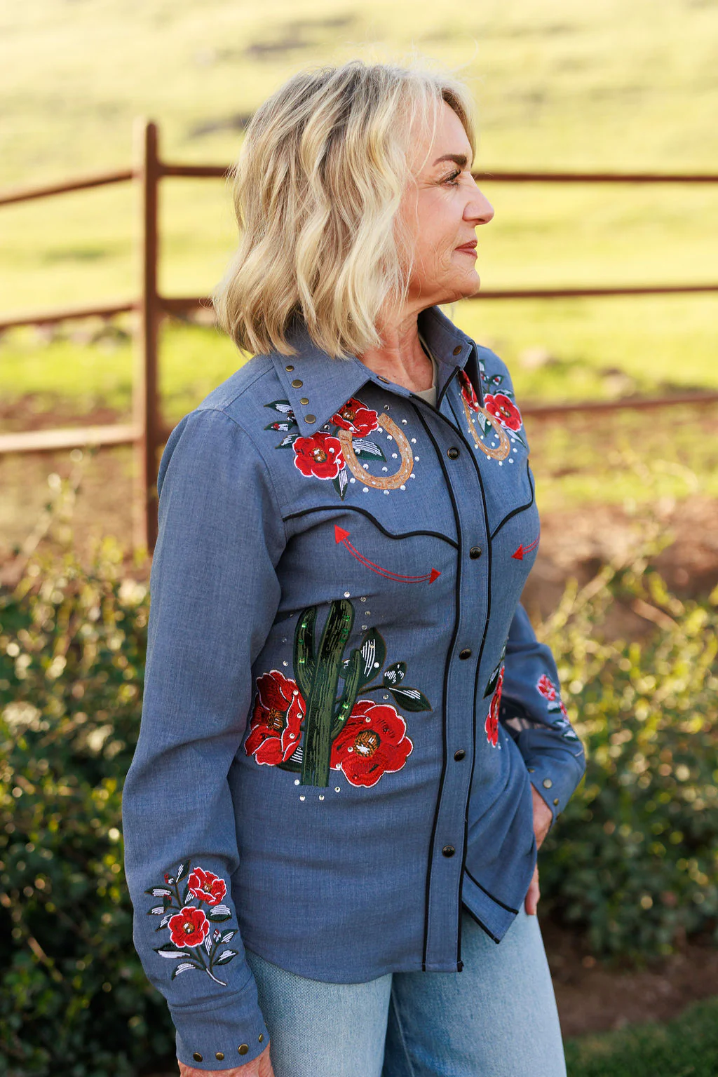 Drift into western wonder with the Denim Daydream Button Up — a denim-hued beauty blooming with embroidered roses, cactus, and sparkling rhinestones. Smiley arrows and chain-stitched “Denim Daydream” details add a playful spirit, while a grand rose scene on the back makes this shirt pure cowgirl magic from every angle. Bold, artful, and full of Rodeo Quincy charm — it’s denim done the dreamy way.