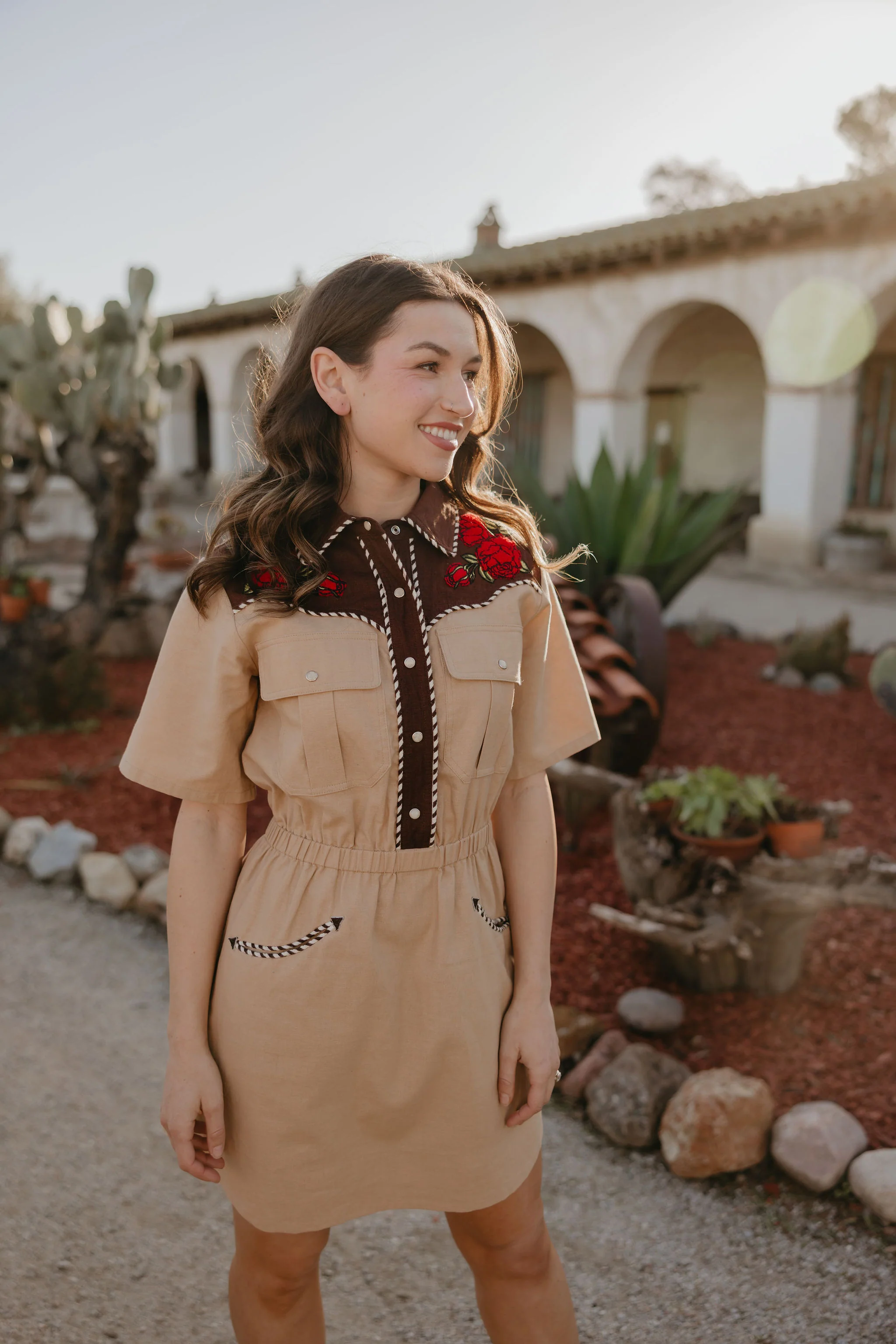 The Santa Rosa Range Dress brings sweet western charm in every stitch—soft tan fabric, smile pockets, pearl snap buttons, and rose patch details for that extra flair. It’s classic, confident, and made to turn heads. Ready for Sunday brunch or sunset rides.
