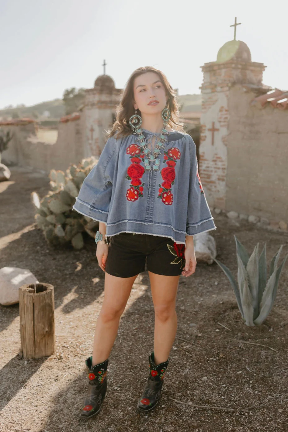 These Ryder Rose Shorts are the perfect combination of style and comfort. The high rise design flatters your figure while the rose embroidery adds a touch of feminine. Made with soft black denim, these shorts will keep you looking and feeling great all day long. Upgrade your summer wardrobe with these must-have shorts.Â